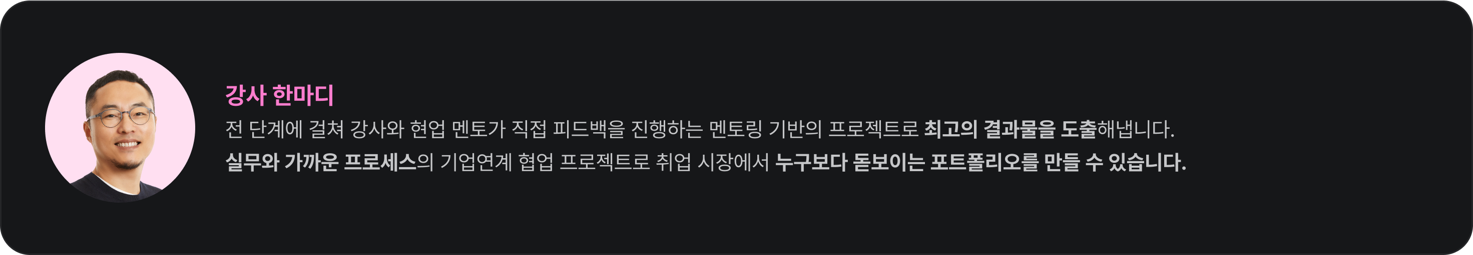 · 기업의 페인포인트를 해결하면서 비즈니스 이해도를 높이고 협업을 경험합니다.