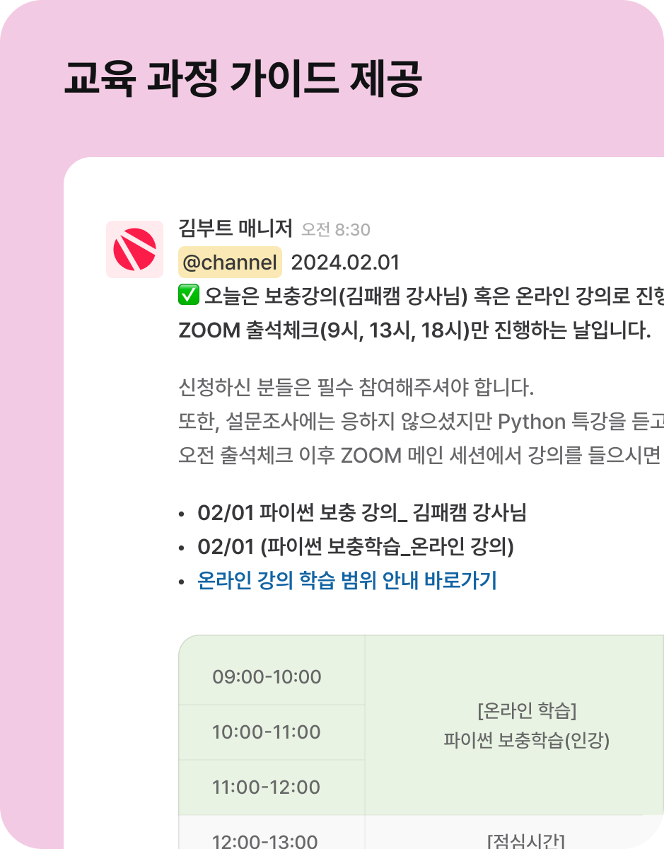 오리엔테이션, 사전 과제, 데일리 공지 등을 통해 과정에 대한 상세 가이드 제공