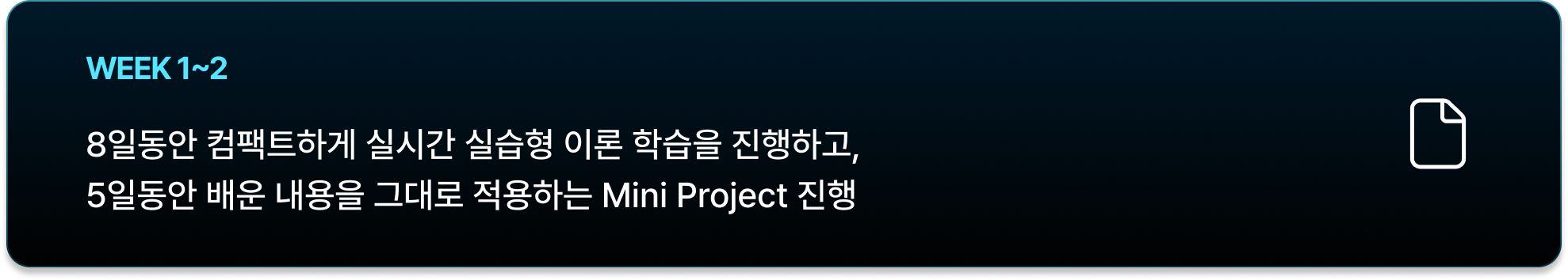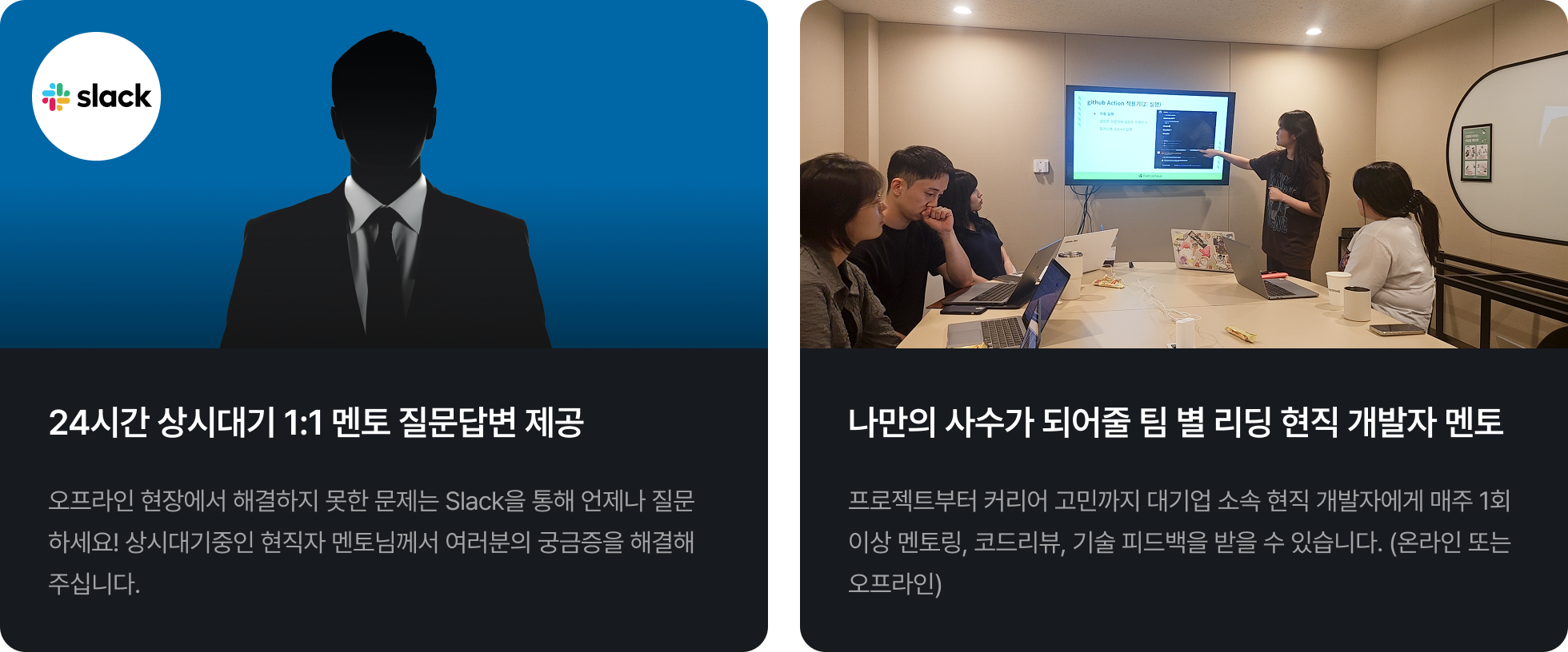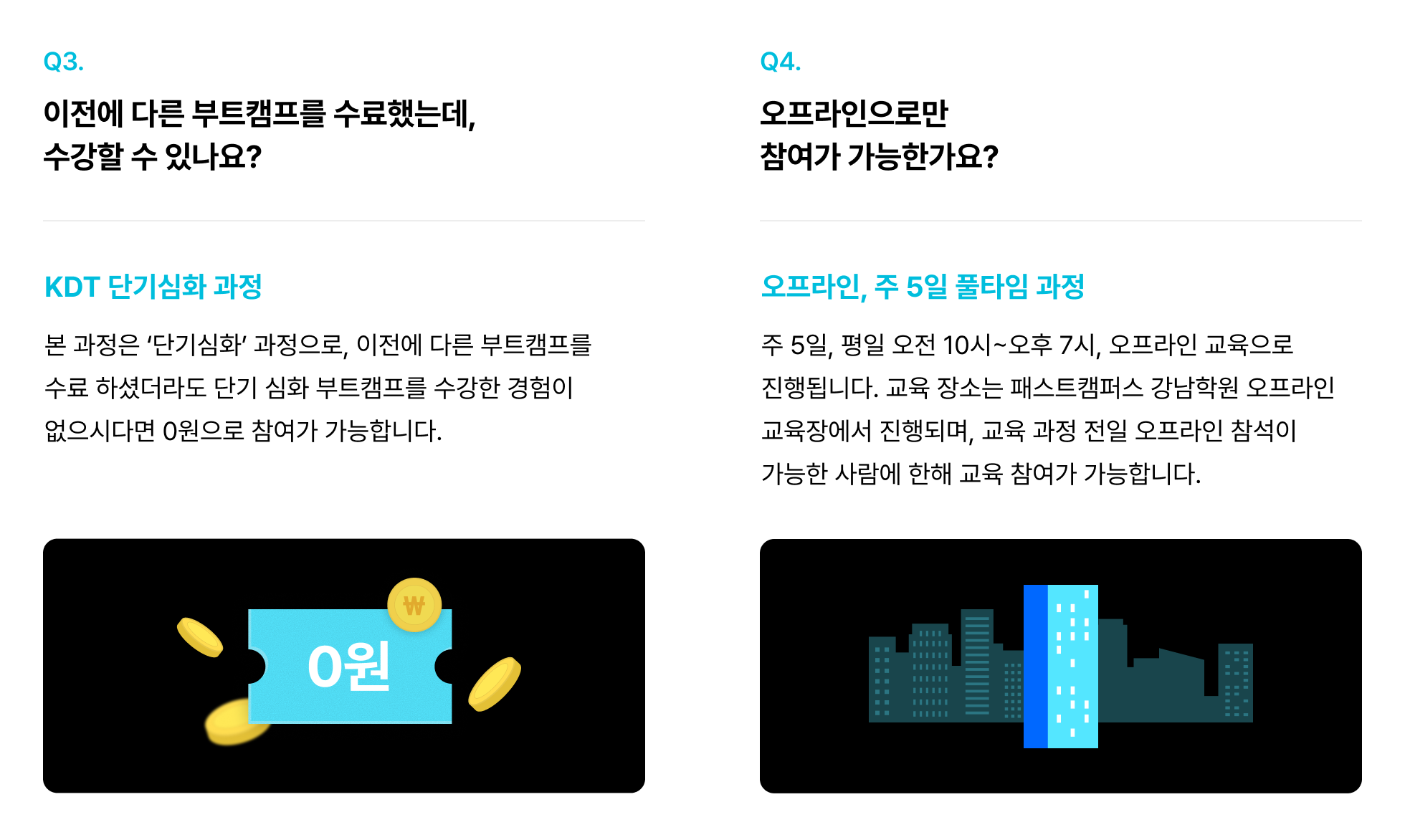 본 과정은 주 5일 오프라인 교육으로 강의장에 대면 출석이 이뤄져야 합니다. 이에 비대면 참석은 불가하며, 국내에 거주하고 강남 오프라인 강의장에 출석이 가능하신 분에 한해서만 수강이 가능합니다.