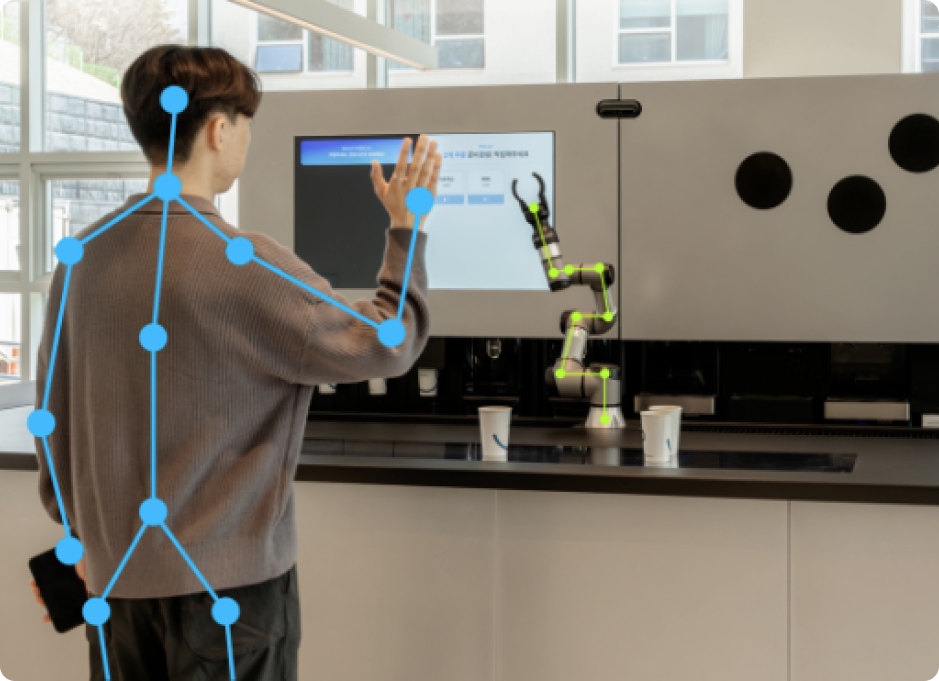 A.I. BASED SAFETY ENHANCEMENT TECHNIQUE3D 비전 기술 기반의 사용자 안전화 기술, 로봇 및 사용자의 뼈대를 인식하고 로봇의 속도와 경로를 실시간으로 수정하여 충돌 리스크를 현저히 저하