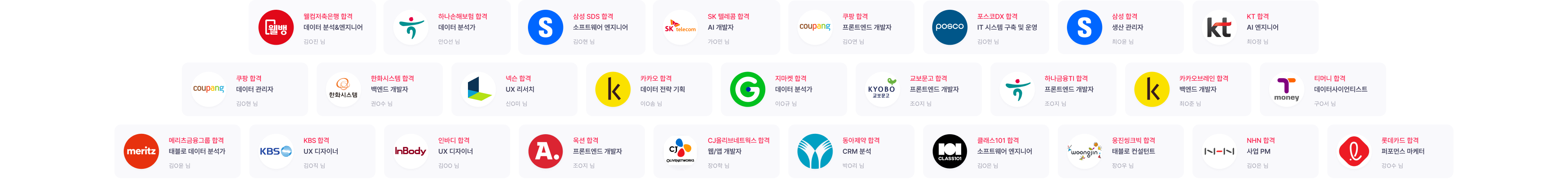 8년 넘게 1,000명 이상의 취준생의 취업을 도와준 취준 전문 컨설턴트 입니다. 취업에 있어서 '직무 역량'과 함께 중요한 것은 '취업 역량'입니다. 이력서, 자기소개, 면접 준비와 함께 데이터 분석으로 여러분이 얻어갈 수 있는 회사 생활 팁까지, 커널 아카데미가 끝나도 합격할 때까지 취업을 책임져드립니다.