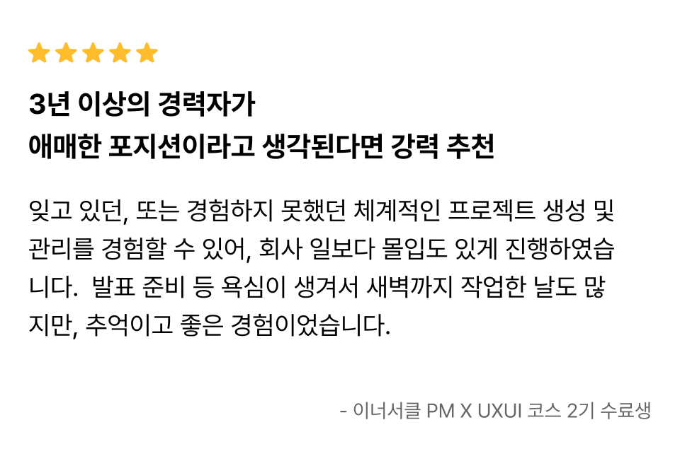 한 단계 더 도약할 수 있는 100% 프로젝트 중심의 재직자 대상 커리어 성장 코스입니다.