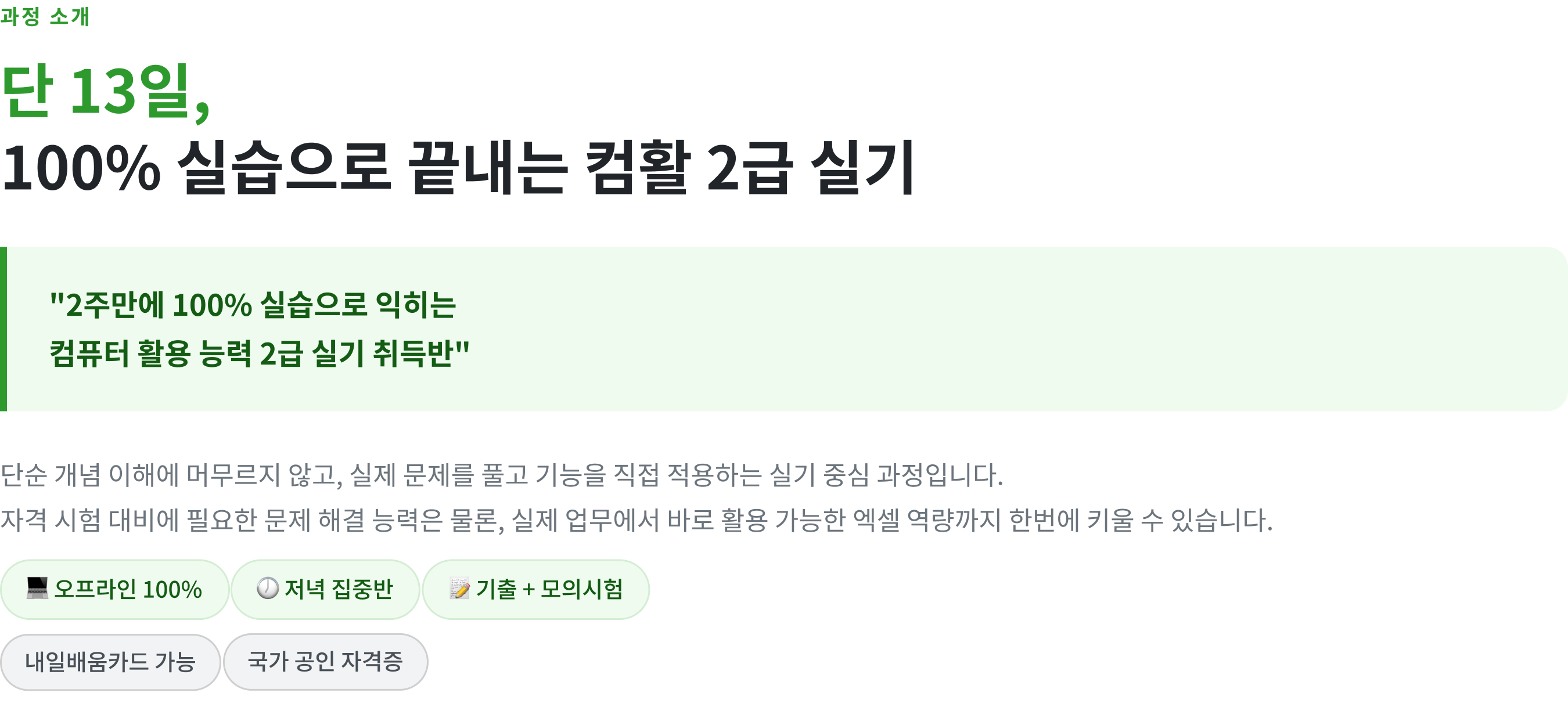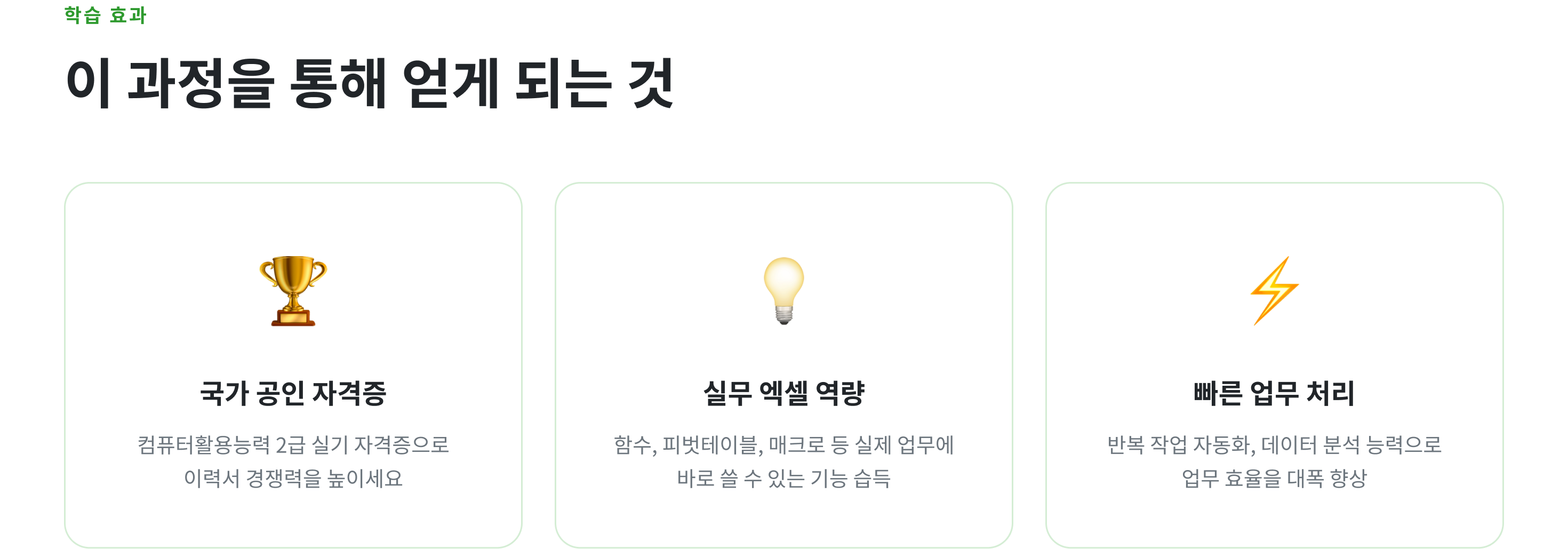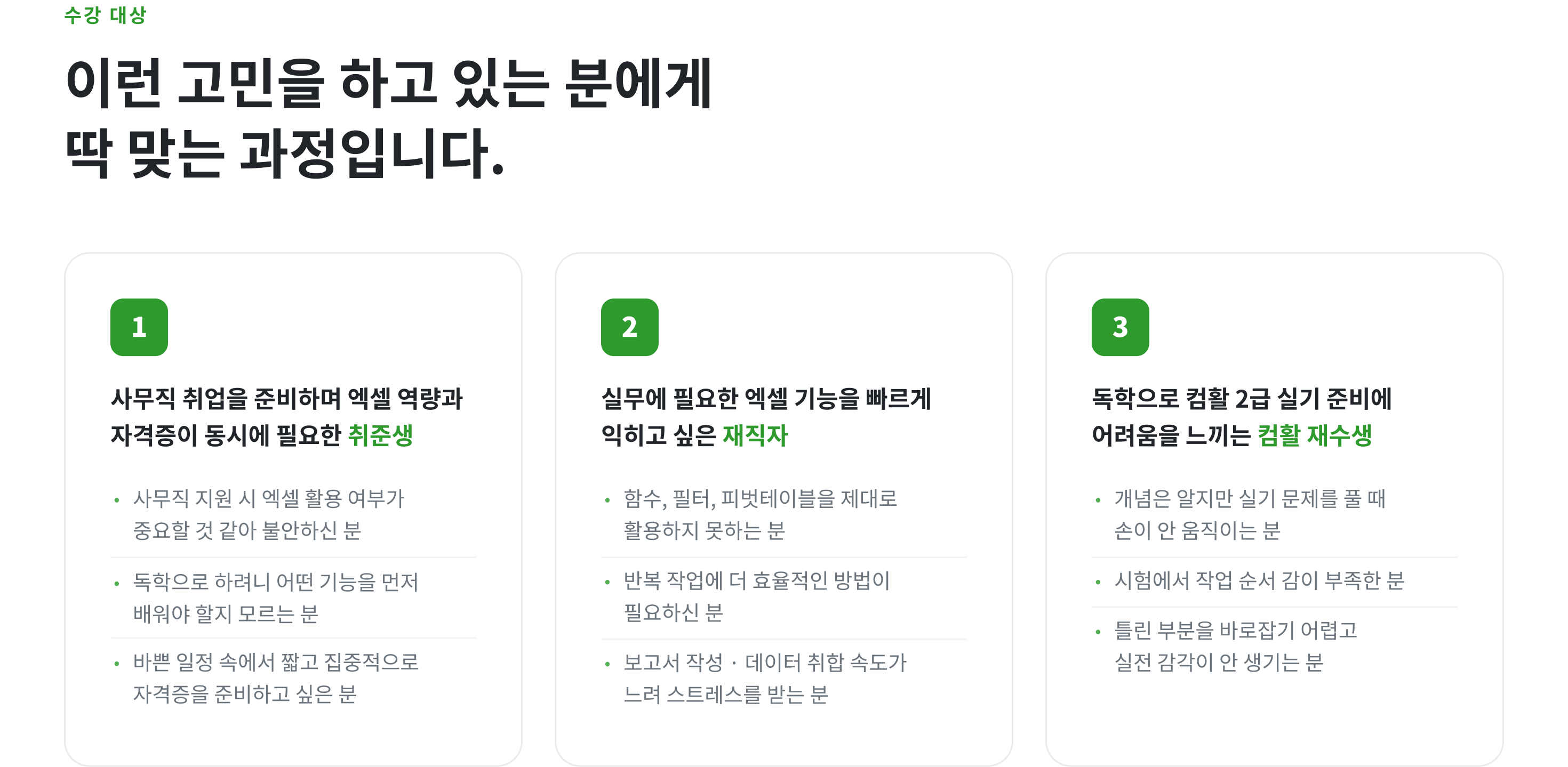 이 과정은 실기 중심으로 구성되어 있습니다. 필기 자격증 취득 여부와 관계없이 엑셀 실기 역량 향상을 목표로 하시는 분이라면 수강