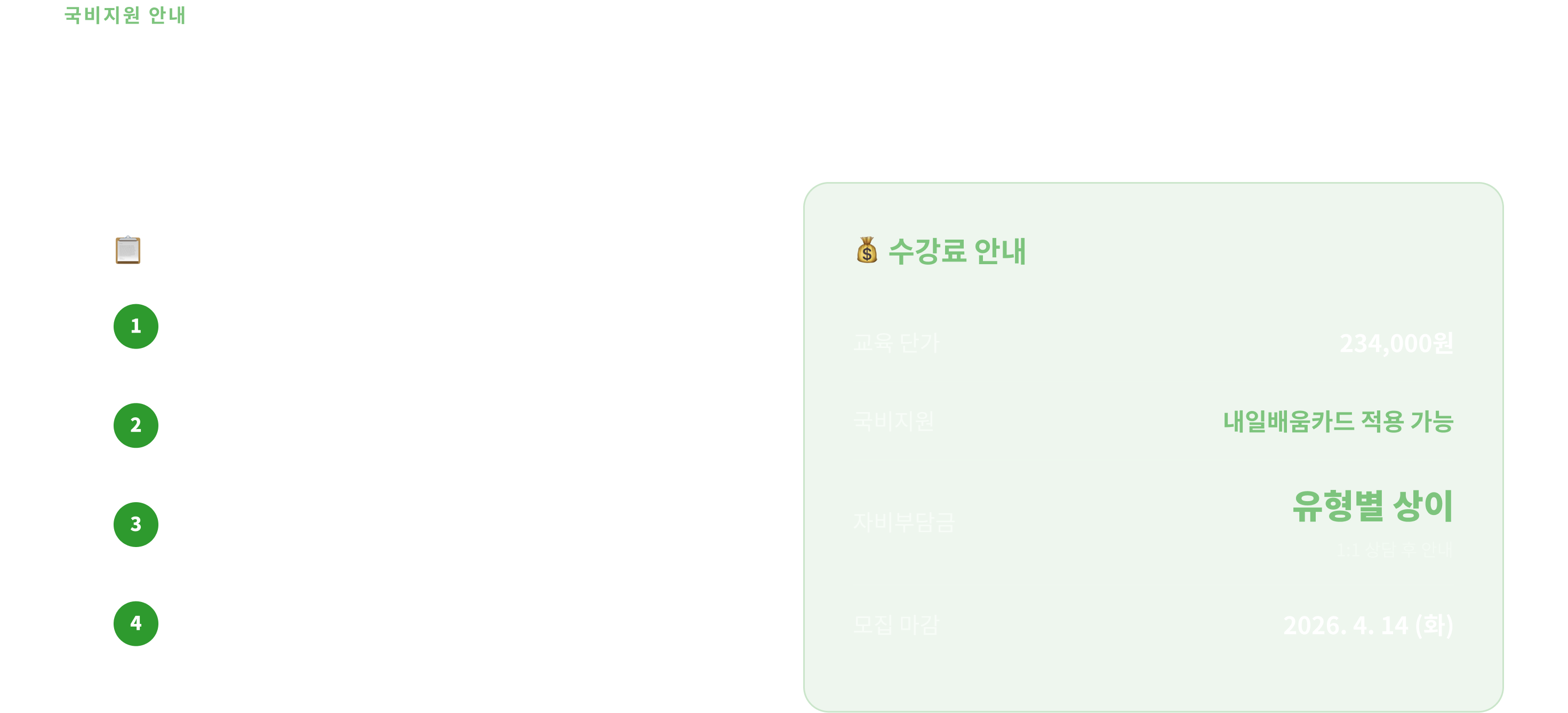 내일배움카드 발급 신청 후 수강하시는 것을 권장드립니다. 카드 발급 여부 및 수강 자격에 대해서는 1:1 상담을 통해 자세한 안내를