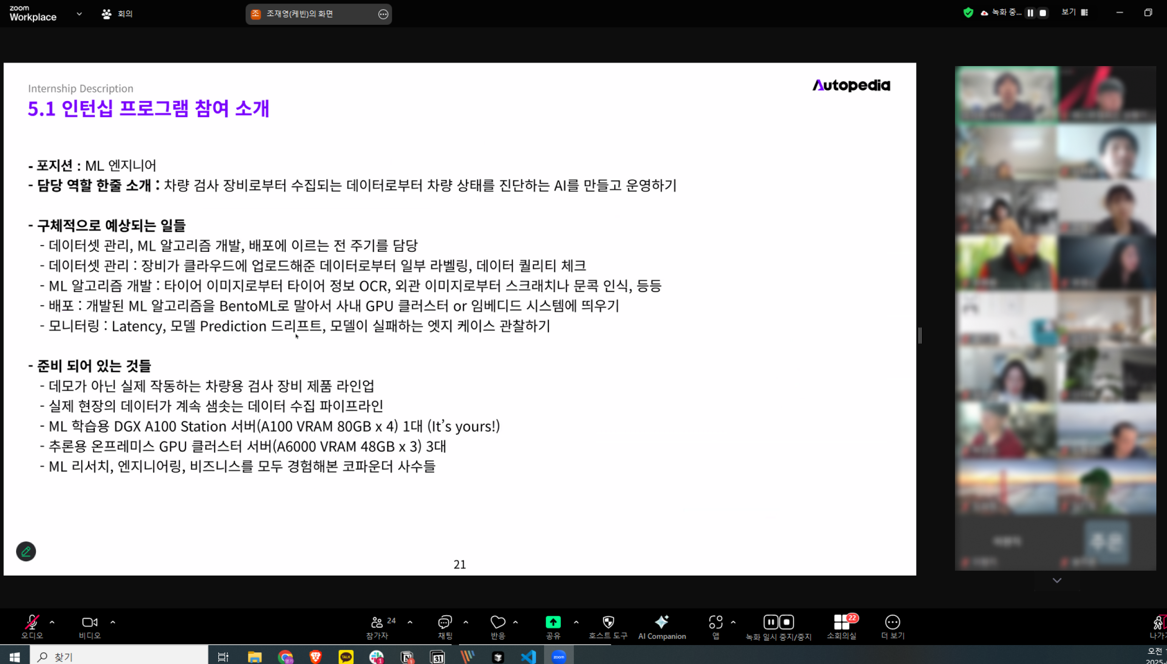 현재 오토피디아에서 8주간 ML 엔지니어 인턴십을 진행 중이에요.