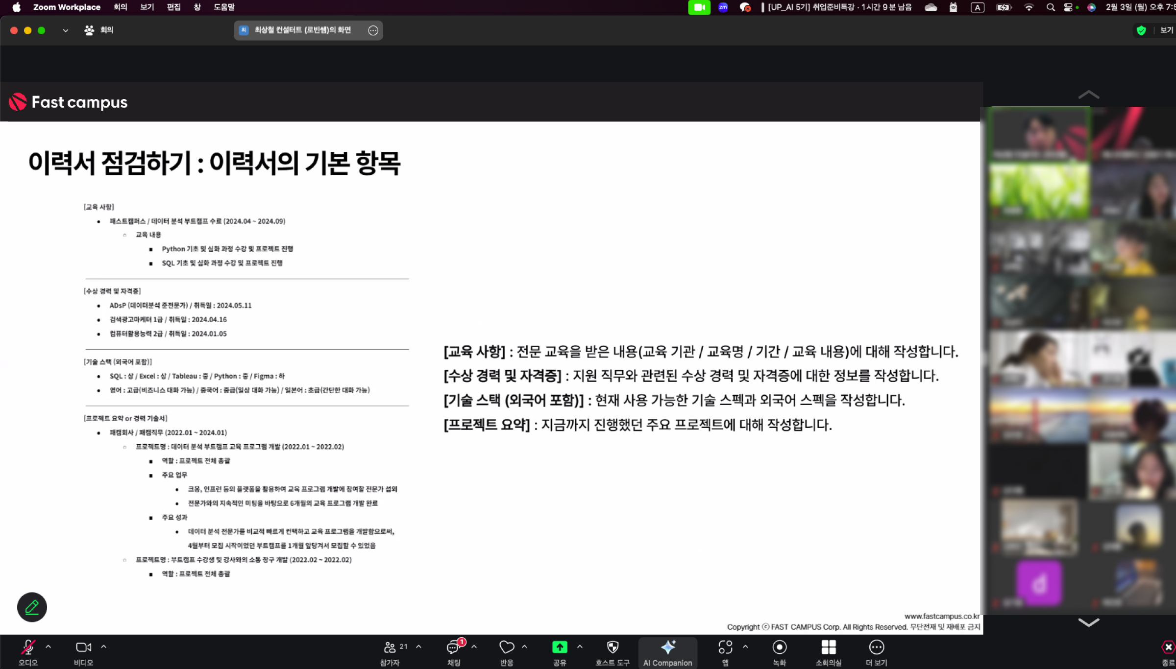 이력서와 그동안 AI 부트캠프에서 진행했던 포트폴리오를 제출합니다. 이 단계도 그냥 진행되는 법 없이 기업을 알아갈 수 있는 기업 설명회를 진행하고, 이력서와 포트폴리오 특강과 첨삭을 진행합니다.