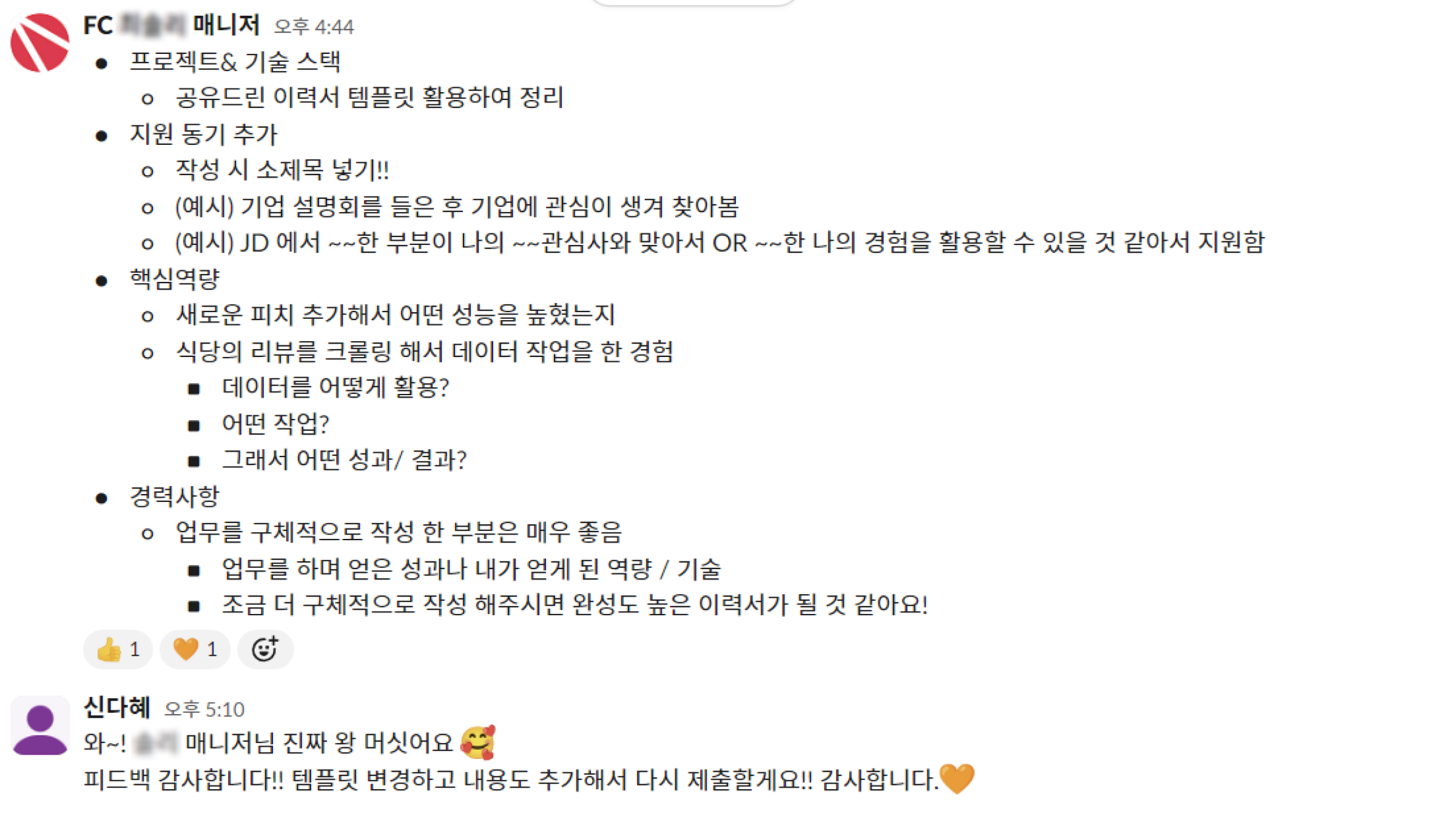 - 1:1 첨삭 (부스트 커리어): 꼼꼼한 피드백을 통해 실무에 적합한 이력서를 만들 수 있어요.