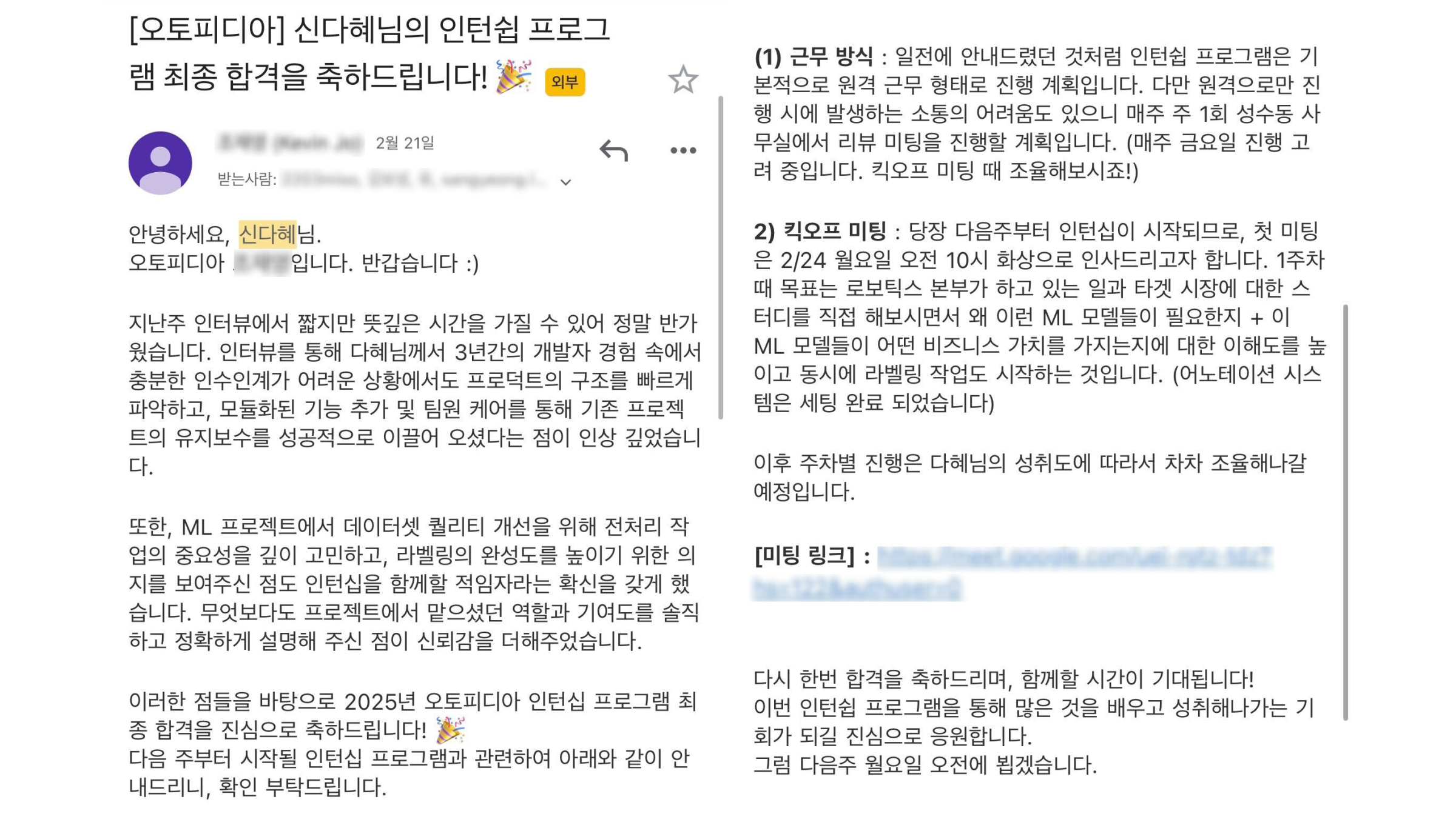 합격 소식을 들었을 때는 "면접에서 답변 못한 것도 많은데? 나 진짜 된 거야? 우와!" 하는 반응이었어요. 😂
