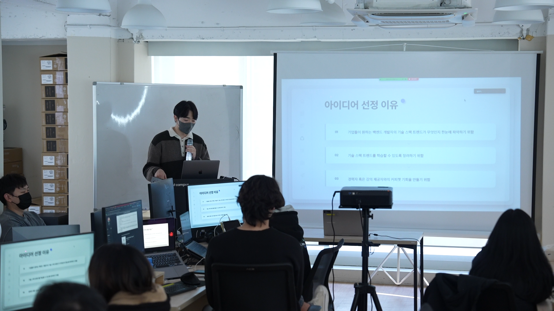 수강생들은 본인이 기획한 아이디어의 개요, 필수로 넣고자 하는 기능, 비즈니스 로직, 사용 예정인 스택, 리크루팅 등을 발표하며 본인의 주제를 어필하는 시간을 가졌습니다.