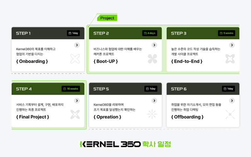 Kernel360에서는 여러 개의 프로젝트가 예정돼 있는데 몸풀기로 해커톤을 진행하고, 한 달짜리 프로젝트로 실전 개발 사이클을 경험하고 그 다음에 제대로 프로젝트를 경험할 수 있는 5달 짜리 프로젝트가 있어요.