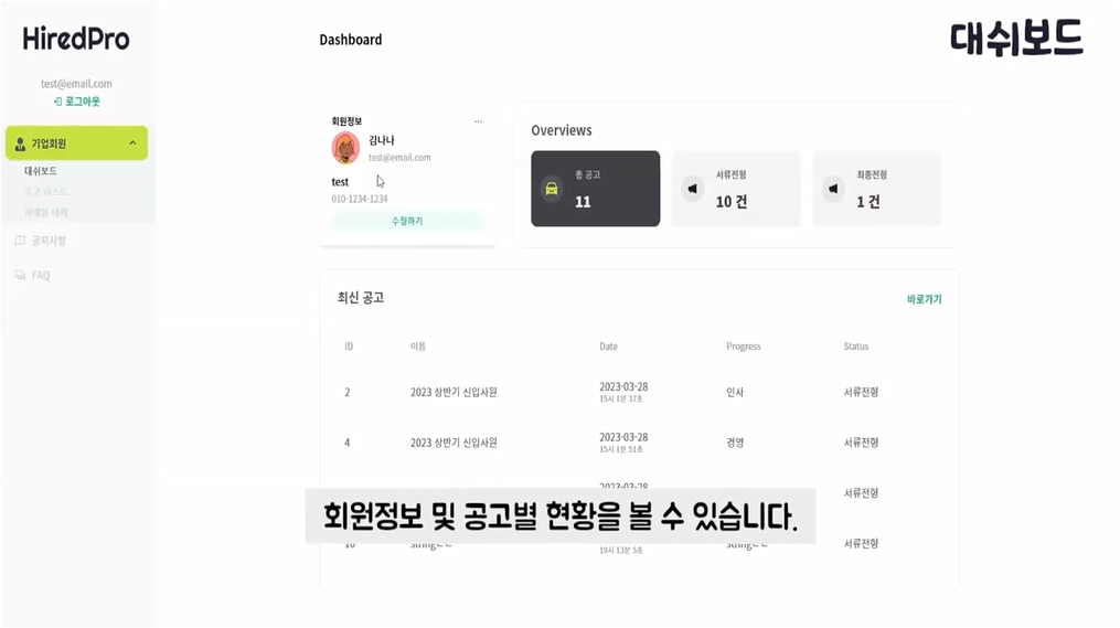 4조 기업 채용 관리 서비스 ‘하이어드 프로’ 웹페이지 시연 화면