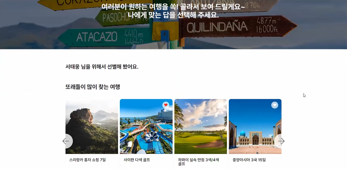 주요 기능은 가독성 좋은 디자인을 바탕으로 여행지를 카테고리별로 묶어서 소비자에게 제공하는 것이었습니다. 또한, 국가별 여행지 검색을 통해 해당 국가가 포함된 여행 패키지에 소비자들이 쉽게 접근할 수 있게 설계했습니다.
