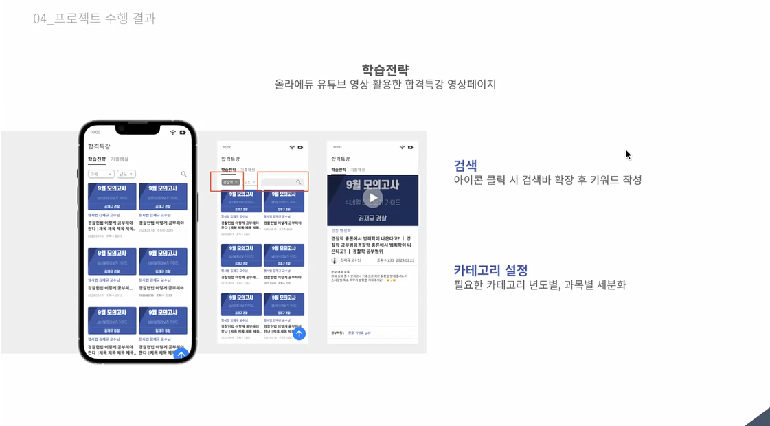 카테고리별로 세분화된 검색 기능을 통해 담당 교수님별로 영상을 분류하여 연관 영상이 제공되도록 설계했어요. 프로젝트 기능을 통해 데이터를 좀 더 쉽게 사용할 수 있도록하며 기존 사용자 경험의 개선 및 신규 이용자의 유입을 기대해 볼 수 있었답니다.