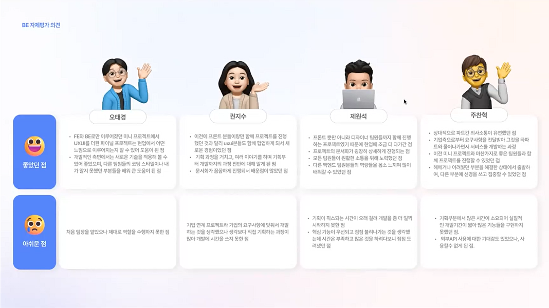 아쉬운 점이 남는다는 것은 그만큼 열심히 했다는 사실의 반증이라는 거! 이렇게 스스로 느낀 점이 있다는 사실만으로도 큰 성장을 이루었다는 뜻이니 수강생 여러분 모두 아쉬움보다는 뿌듯함을 가져가시면 좋겠습니다. 이 느낌을 훌륭한 개발자가 되어서도 계속 이어가면 더 좋고요!