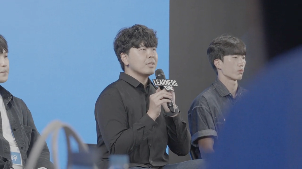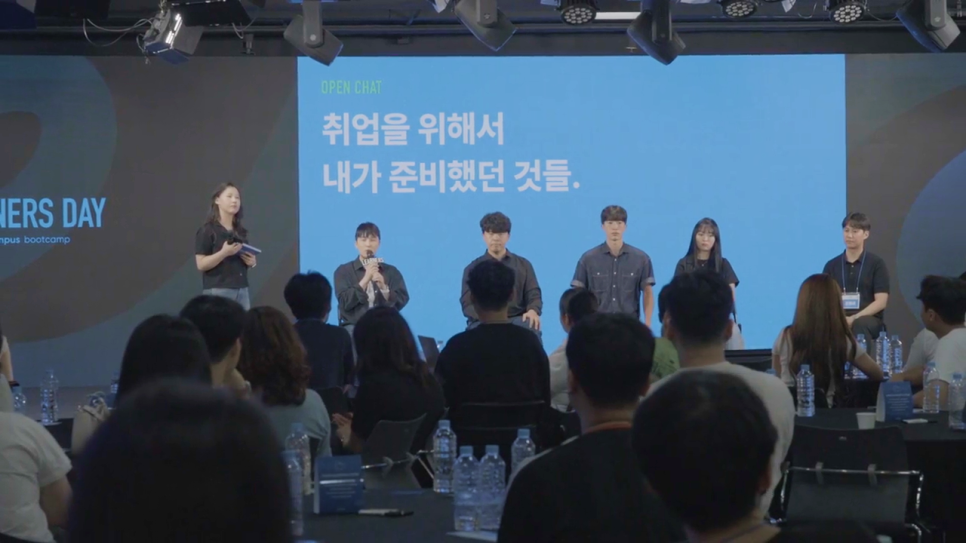 1시간가량 이어진 시간 동안 다섯 명의 선배 러너들은 미래를 향한 도전을 이어가고 있는 후배 러너들에게 실질적인 도움이 되는 다양한 취업 정보를 공유했습니다. 국비지원 부트캠프를 수료한 비전공자라는 공통점을 가진 선배 러너들이 직면했던 도전과 이를 헤쳐 나간 방법은 후배 러너들에게 소중한 실마리가 되어 주었죠. 취업 노하우가 살아 숨 쉬었던 오픈 마이크 프로그램을 끝으로 제2회 러너스데이 1부는 막을 내렸습니다.