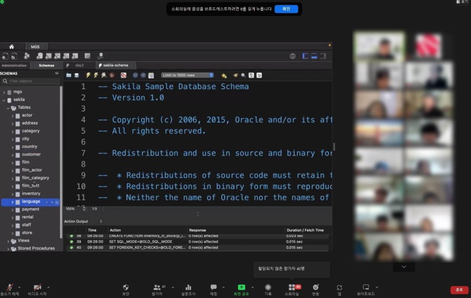 데이터 분석가 필수 항목인 SQL 실시간 강의 모습