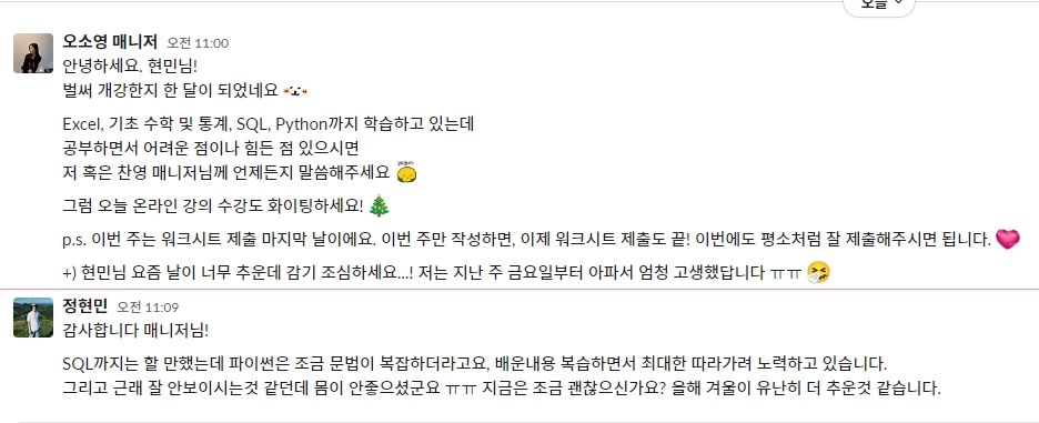 부트캠프 과정 중에는 대부분 슬랙 메신저를 통해 매니저님들과 소통했습니다. 빠른 응답으로 커리큘럼 시작부터 끝까지 피드백을 상세히 해주셨어요.