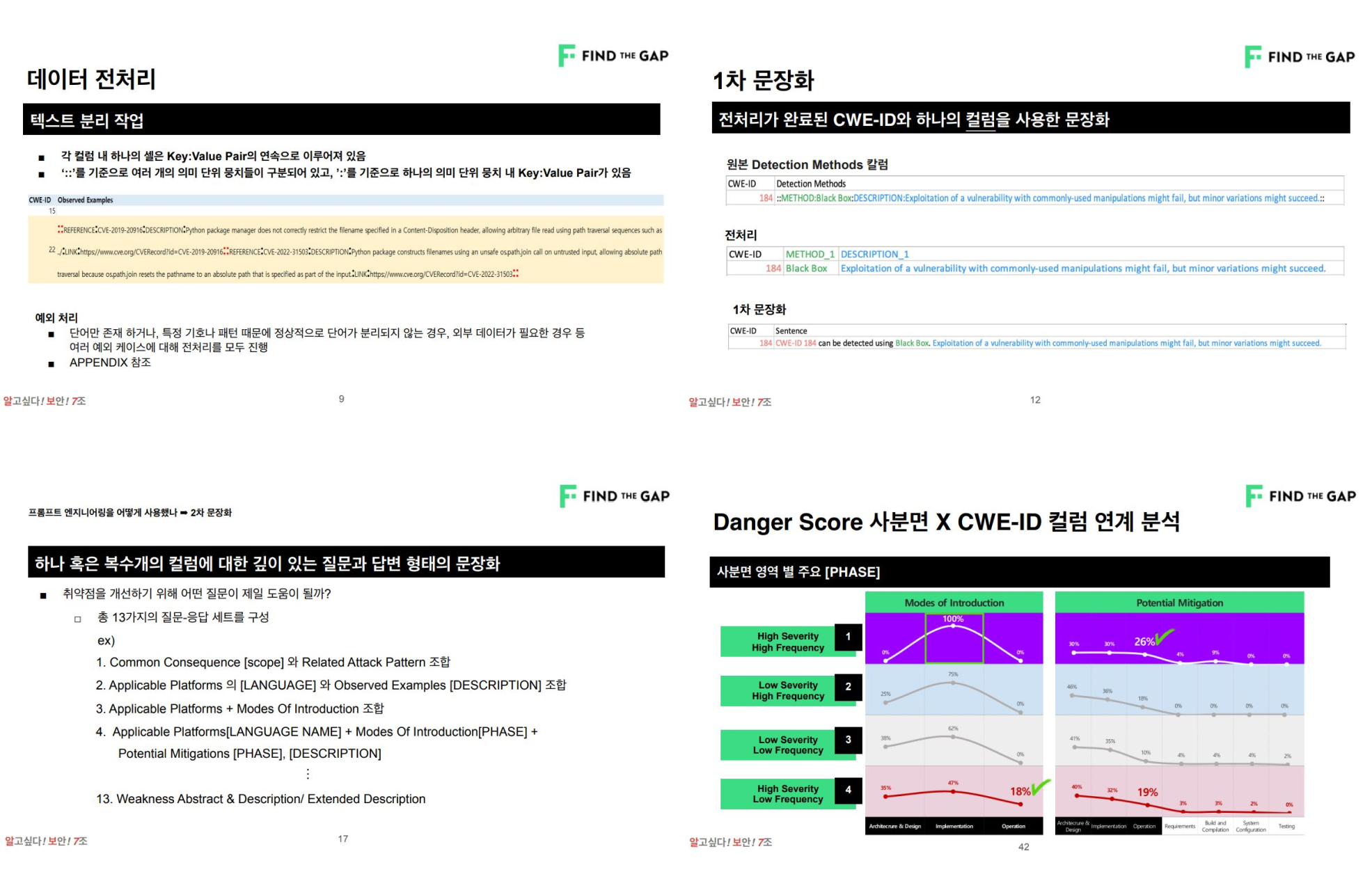 더불어 문장화 과정에서 얻은 인사이트들로 기업 담당자 분들이 수많은 보안 취약점 데이터를 간단하게 정리해서 볼 수 있는 시각화 자료도 추가적으로 제공해 드렸어요.