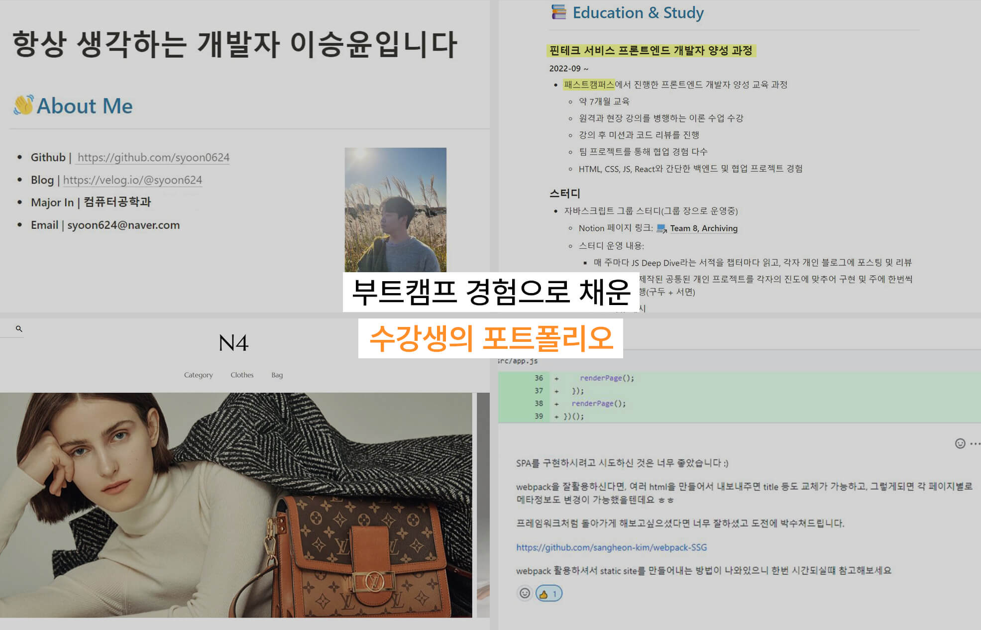 제가 부트캠프 참여 전에 세웠던 목표가 바로 ‘수료 전에 취업을 하자’였어요. 꽤 오랜 시간 동안 취업 준비를 했으니, 이력서나 자기소개서는 어느 정도 진행 중이었거든요. 그런데 포트폴리오는 부트캠프 경험을 통해 100% 구성했어요. 사이드 프로젝트부터 파이널 프로젝트까지 직접 만들었던 웹사이트 링크나 직접 짠 소스 코드, 협업을 통해 어떤 기술을 사용했는지 자세하게 적었습니다.