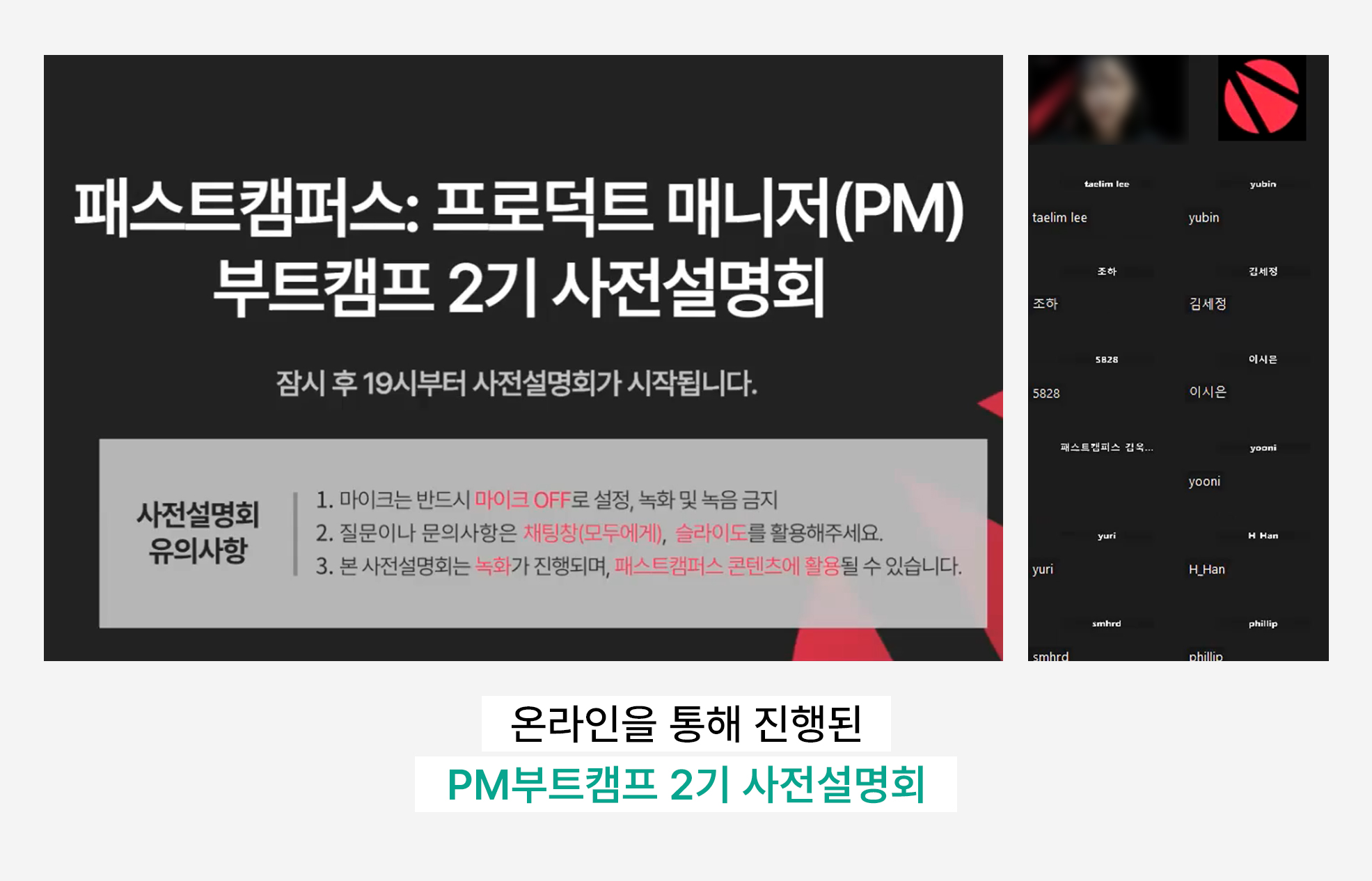 언제 어디서나 수강생을 도와주는 운영팀과 매니저가 함께하고 있기에, 접속 오류가 나타나도 금세 해결할 수 있고요. 덕분에 PM부트캠프 2기 사전설명회는 1분 1초도 늦지 않고, 정각에 맞춰 시작됐습니다.
