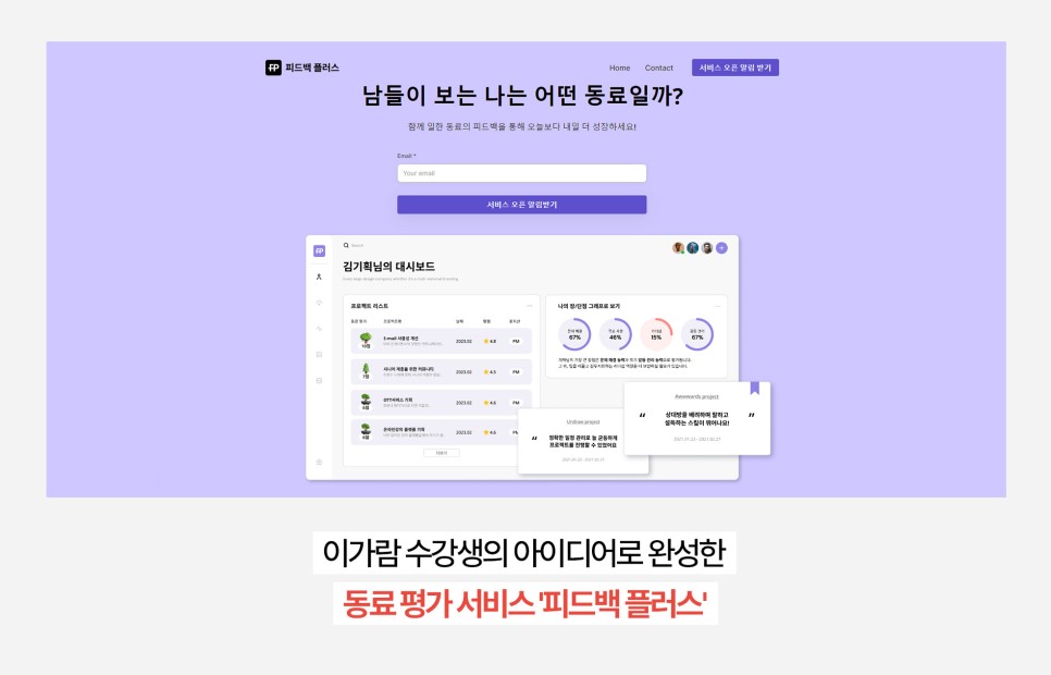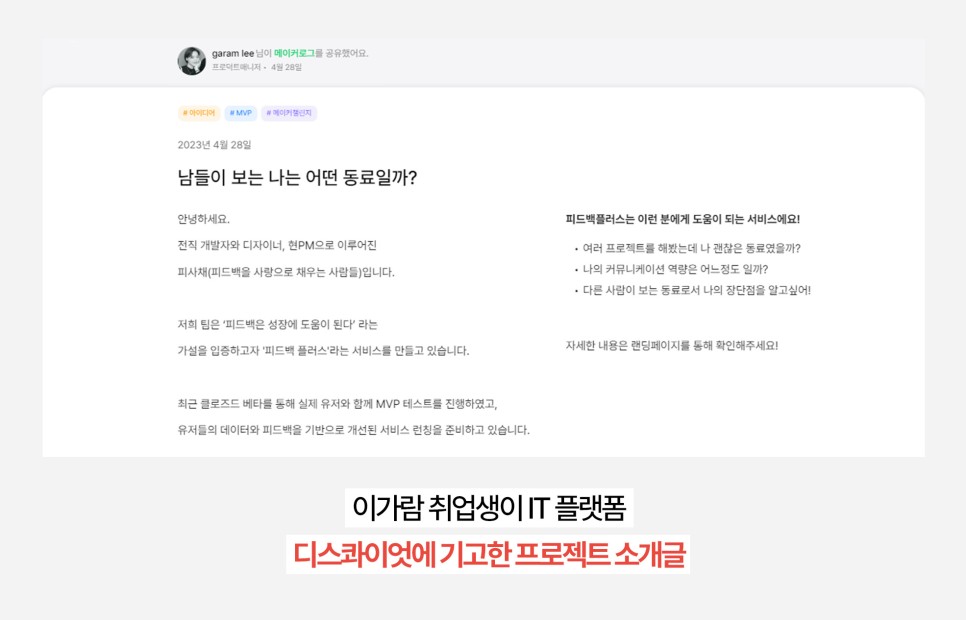 PM 직무에 대해 자신감이 부족해 의기소침할 때 동료 수강생들의 피드백 받고 의욕이 생긴 경험을 했었어요. 이 경험을 살려 세 번째 프로젝트 때 ‘피드백플러스’라는 동료 평가 서비스를 기획했습니다. 기획에서 끝내기는 아쉬워 실제 운영까지 해보고자 IT 소셜 네트워크 ‘디스콰이엇’에 피드백플러스 홍보 글을 올렸어요.
