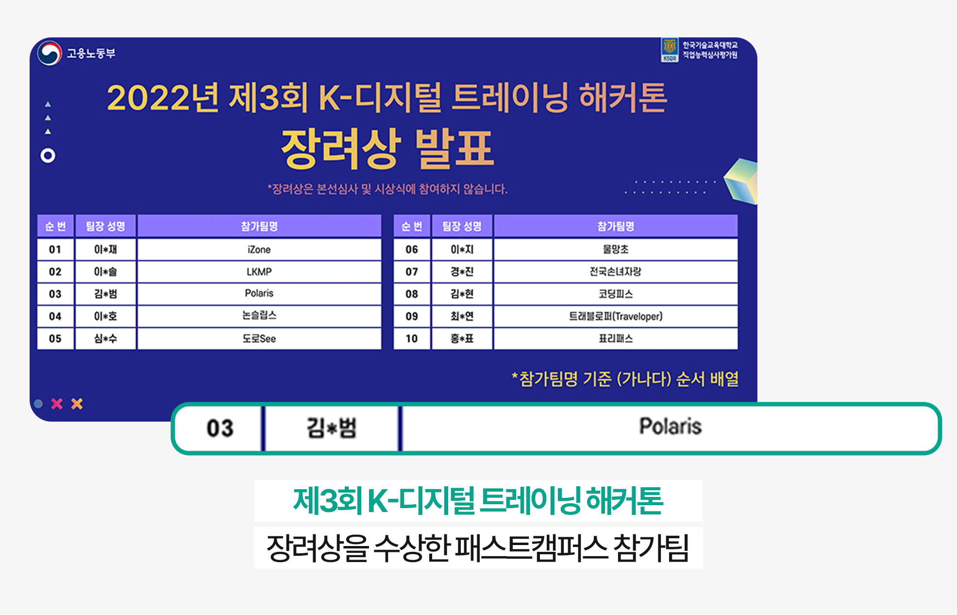 여기, ‘꺾이지 않는 마음’으로 원하는 결과를 이루어낸 팀이 있습니다. 바로 패스트캠퍼스 AI 부트캠프 수강생팀입니다. 3기 수강생 5명(김재범, 신승혁, 이용진, 정성우, 허진성) 으로 이루어진 ‘Polaris’팀은 지난해 열린 제3회 K-디지털 트레이닝 해커톤 대회에서 장려상을 수상했습니다. 이 대회는 전국에서 150개 팀이 참가할 만큼 경쟁률이 높은데요. 전원 비전공자로 이루어진 패스트캠퍼스 수강생팀이, 어떻게 짧은 시간 내에 좋은 결과를 낼 수 있었을까요?