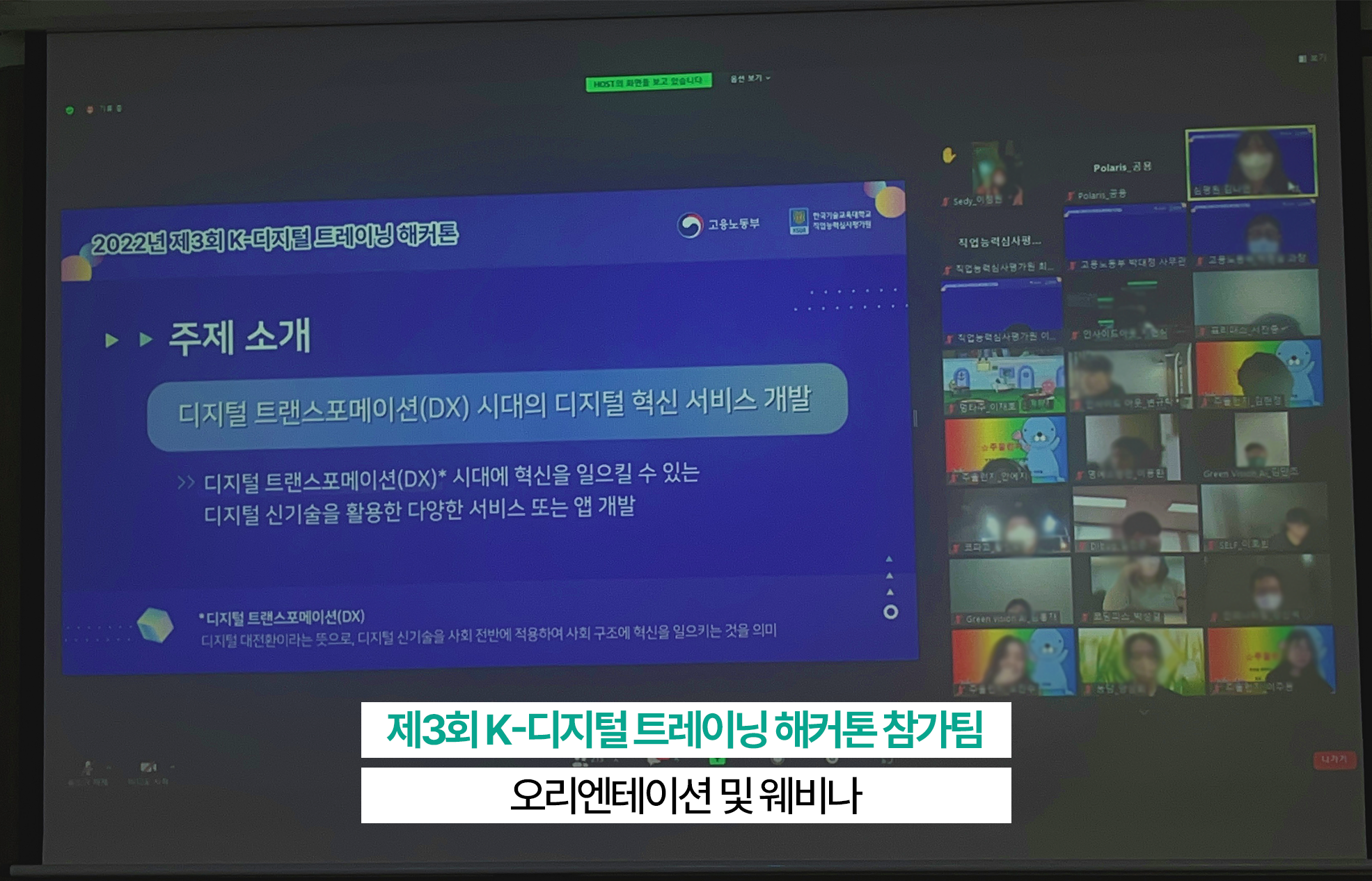 👨🏫 김용담: K-디지털 트레이닝 해커톤은 고용노동부에서 개최하는 디지털 서비스 개발 대회입니다. K-디지털 트레이닝 훈련에 참여하고 있는 수강생 팀이나 참여 완료한 수료생 팀이 참가할 수 있고요. 주제에 맞게 프로젝트를 진행하고, 제출하여 그간 쌓아온 디지털 신기술 분야의 역량을 발휘할 수 있는 좋은 기회이죠.