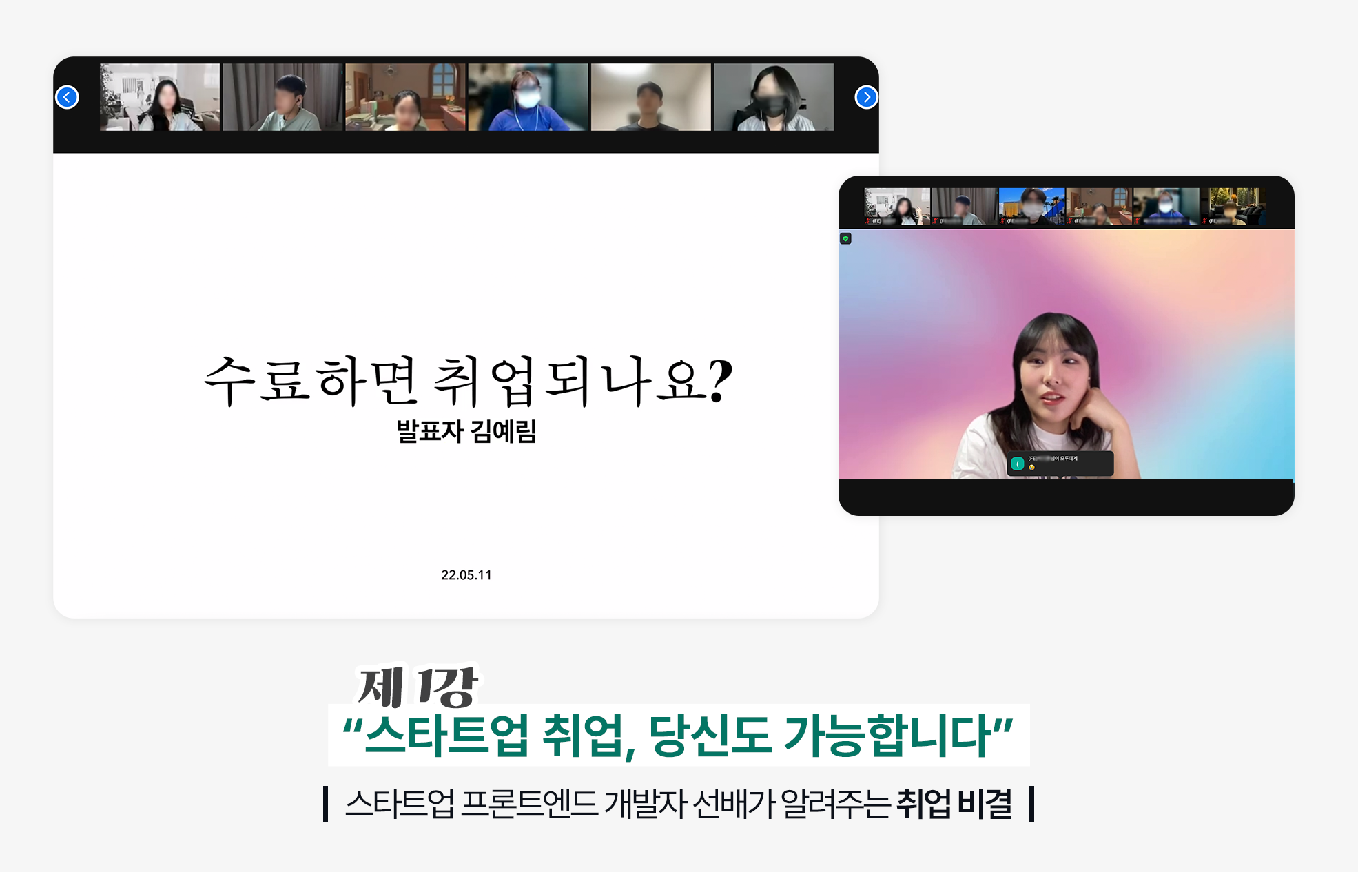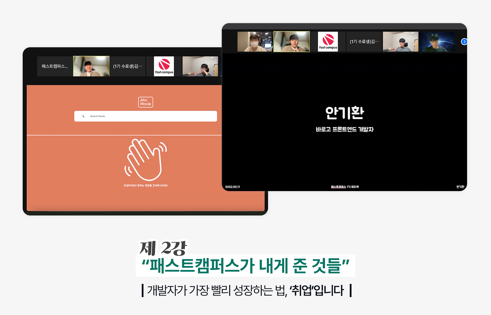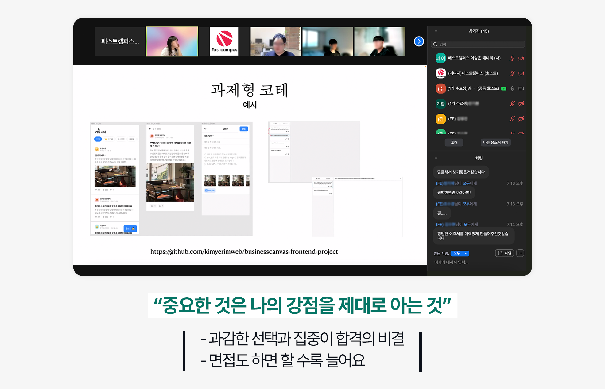 패스트캠퍼스 프론트엔드 개발 부트캠프의 두 수료생이자 선배 개발자는 선배만이 말해줄 수 있는 피부에 와닿는 취직 꿀팁들을 대방출했는데요, 위로와 조언으로 가득했던 이번 특강은 수강생들의 큰 호응을 얻었습니다. 과연 어떤 이야기들이 오갔는지 함께 들어볼까요?