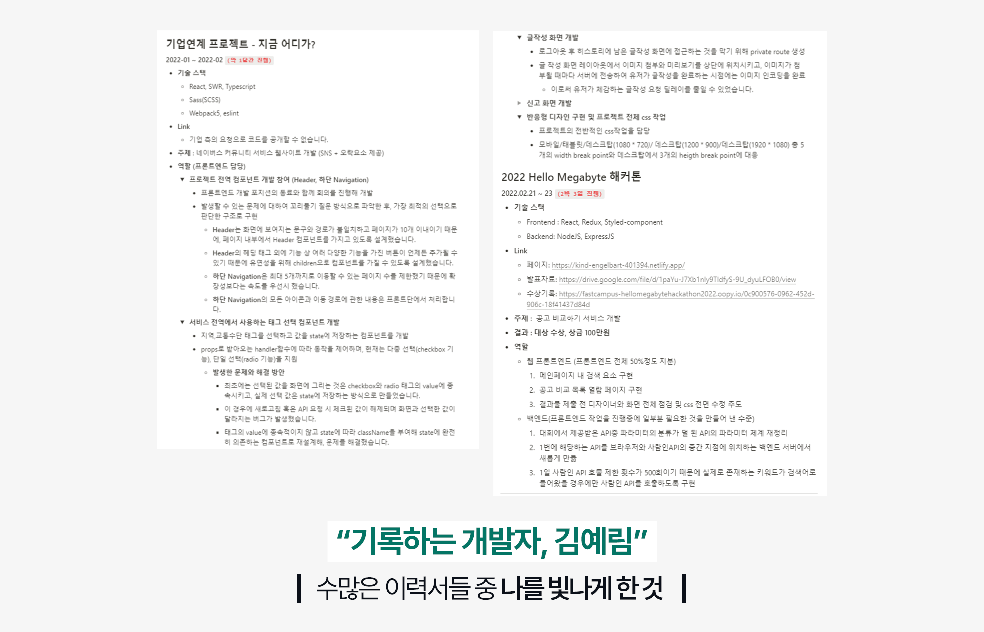 그렇게 만들어진 제 포트폴리오예요. 직무 경험의 대부분이 패스트캠퍼스 부트캠프에서 이룬 것들로 작성되어 있어요. 교육 과정에서 진행한 기업연계 프로젝트와 해커톤에 참가하며 진행한 사항들을 꼼꼼하게 기록했습니다. 발표 자료와 주제, 결과, 프로젝트에서 담당한 역할과 일련의 과정에서 제가 기여한 바를 빠짐없이 적었습니다. 제 이력서의 제목처럼 ‘기록하는 개발자’의 면모를 보여주었죠.