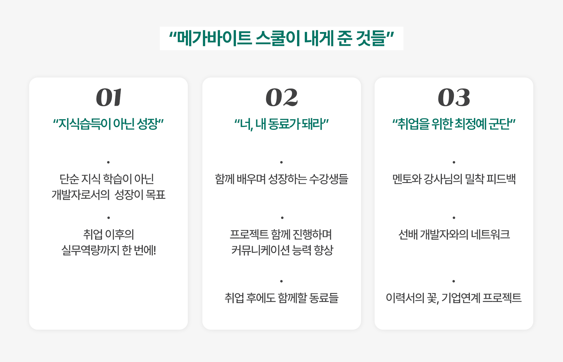 간혹 개발 공부를 하다 보면 멘탈이 흔들릴 때도 있을 거예요. 저는 멘탈 관리가 무엇보다 가장 중요하다고 생각해요. 뭐든 마음먹기 달렸다고 생각하면서 부정적인 생각을 하지 않으려고 했어요. 저만의 방법이 있는데요, 내가 정해 놓은 일과나 메가바이트 스쿨의 커리큘럼 외에 개인적인 공부들을 하는 거예요. 그렇게 공부를 하면서 나는 남들이 쉴 때, 남들이 모르는 것을 공부하면서 남들보다 앞서나간다고 생각하면 자신감을 얻게 돼요.