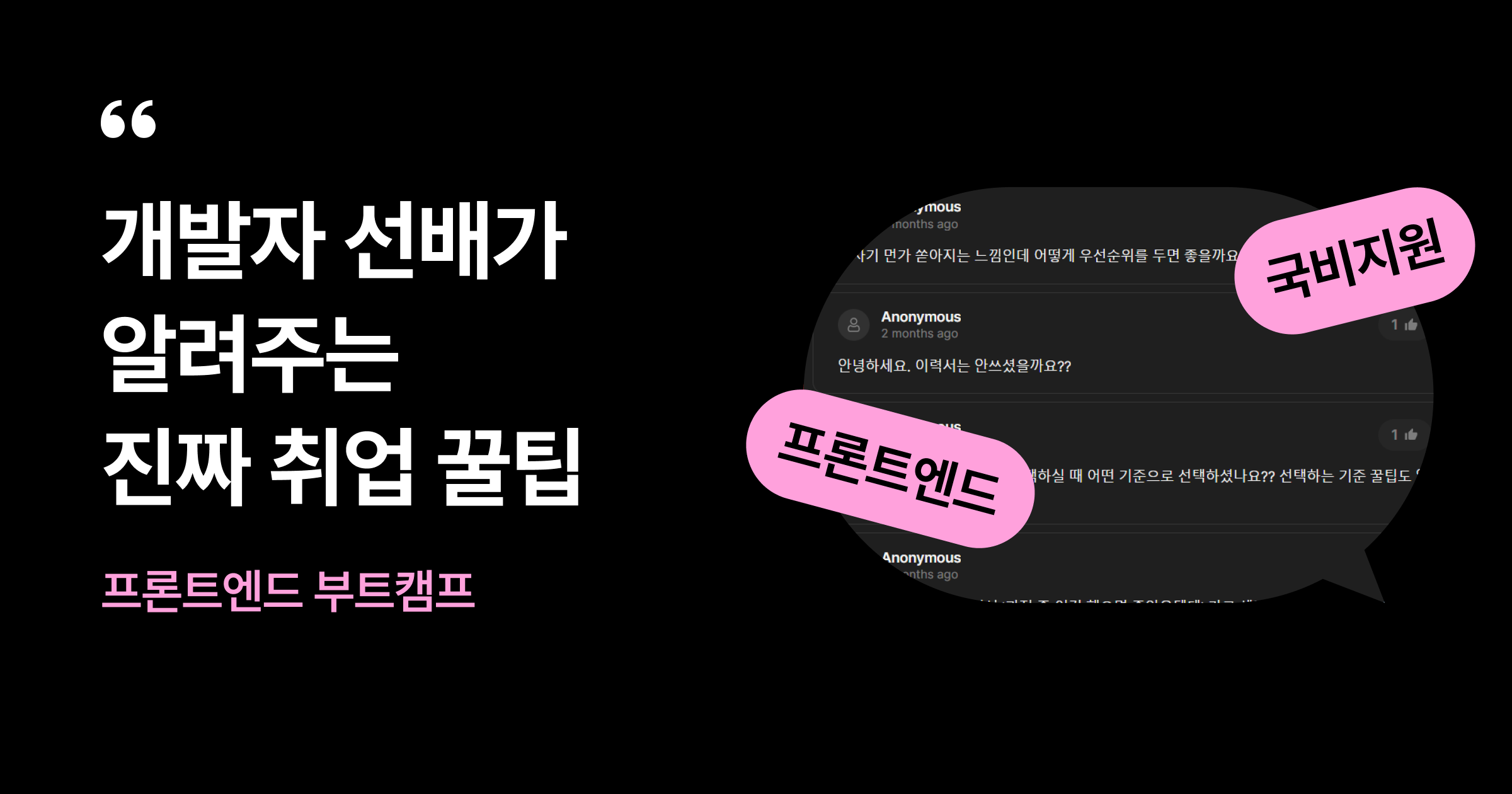 형제가 있는 아기들은 말을 빨리 배운다고 합니다. 처음 말을 알려주는 것은 부모님이지만 아이의 눈높이에서 언어 자극을 주고, 말문을 트이게 해주는 것은 형제라고 하죠. 개발 공부도 언어를 배우는 것과 다르지 않습니다. 특히 새로운 방향으로 취업을 준비하는 부트캠프의 수강생 분들은 하나부터 열까지 궁금한 것이 정말 많을텐데요, 이때 형제처럼 발 벗고 나서서 수강생의 마음을 알아주고 실질적인 도움을 주는‘선배’가 있다면 얼마나 좋을까요?