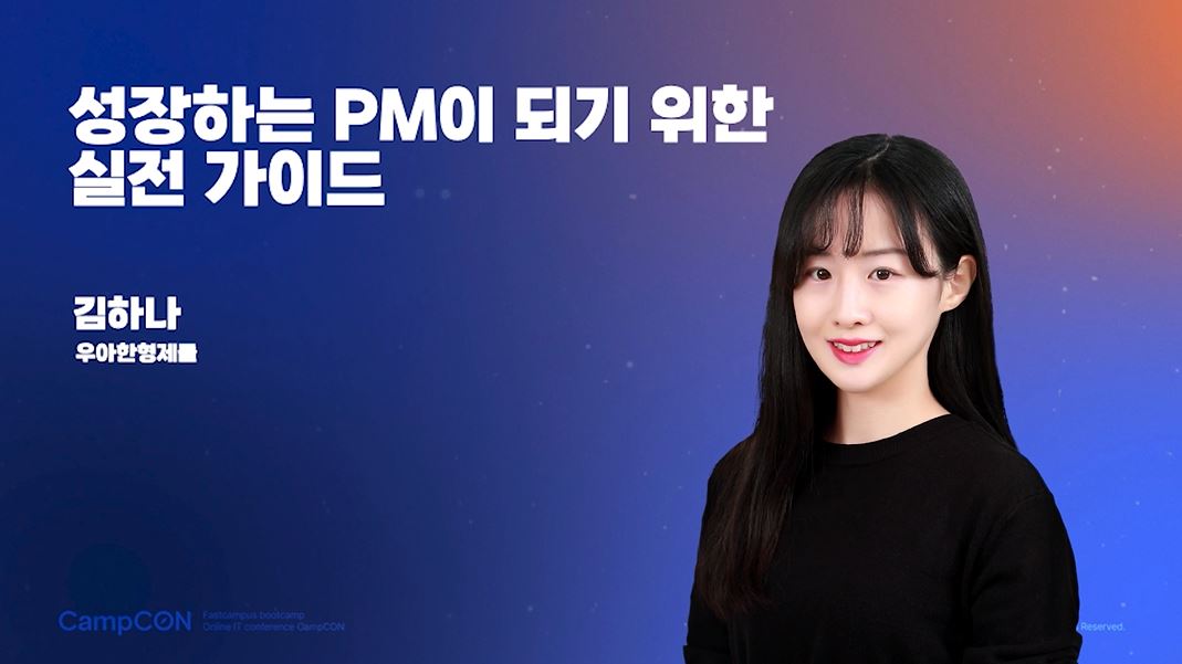 👩🏫김하나 연사: 반갑습니다. 우아한형제들에서 사장님을 위한 접수 채널을 담당하고 있는 김하나 PM입니다. 이번 강연에서는 성장하는 PM이 되기 위한 실전 가이드라는 주제를 가져왔어요.
