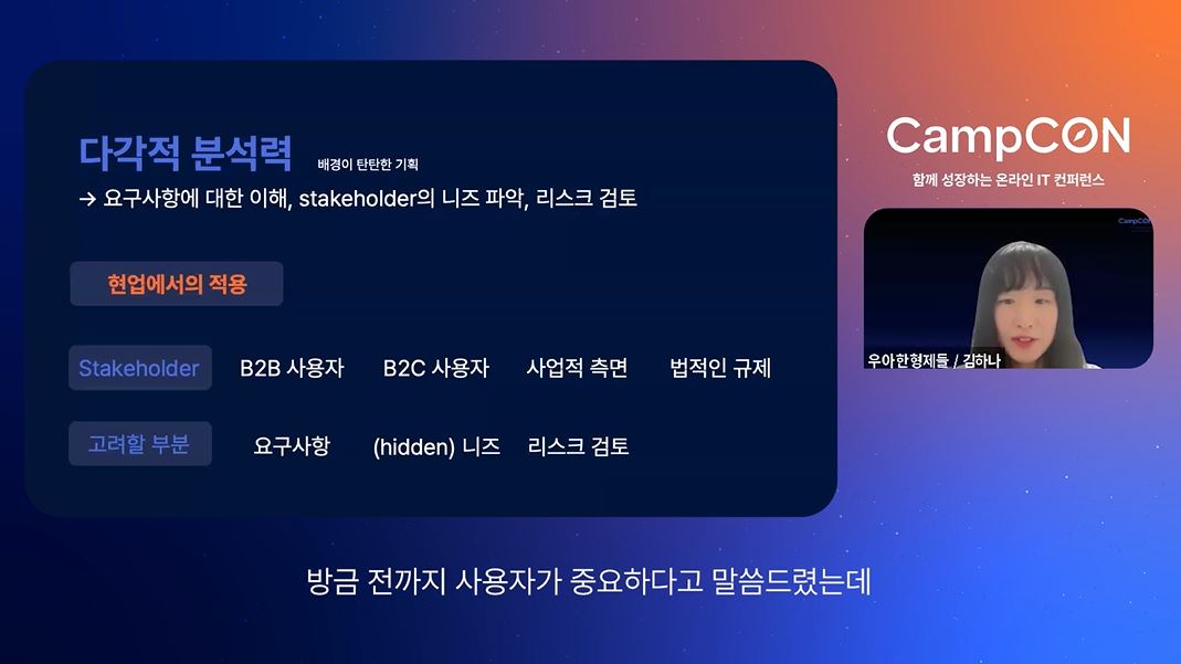 👩🏫김하나 연사: 현업에서 요구하는 PM의 역량 두 번째, 바로 ②다각적인 분석력입니다. 앞에서 사용자가 중요하다고 말씀 드렸는데, 사용자 외에도 많은 이해관계자를 생각해야 해요. 이런 다양한 이해관계자를 고려하는 다각적인 분석력이 PM에게는 꼭 필요하고요.