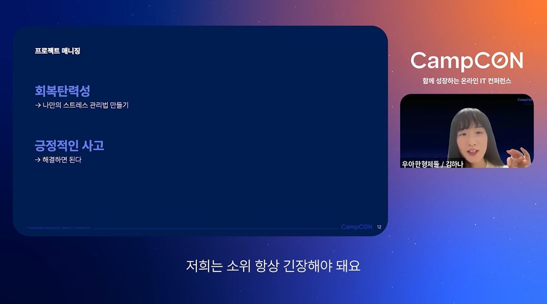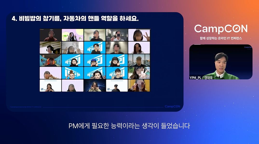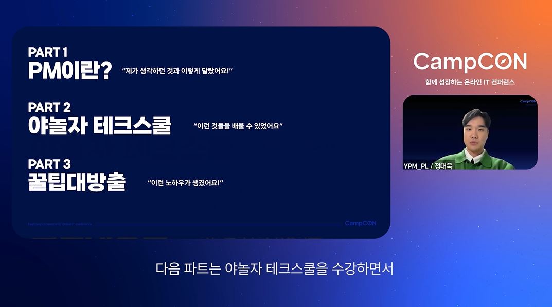 이번 캠프콘에서는 현직자 PM과 우수 프로젝트 리더를 모시고 좋은 PM으로 성장하는 법을 소개했습니다.