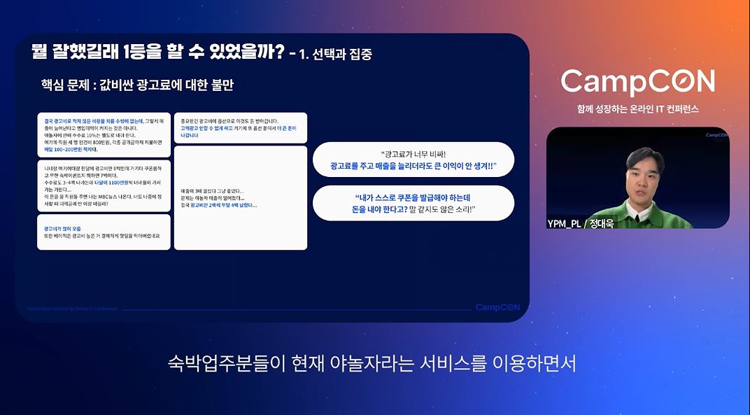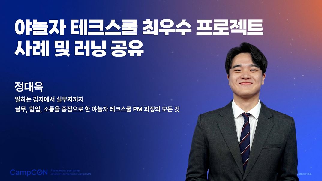 👨🏫정대욱 연사: 반갑습니다. 저는 야놀자 테크스쿨 PM 과정의 최우수 프로젝트 리더를 맡았던 정대욱 수료생입니다.