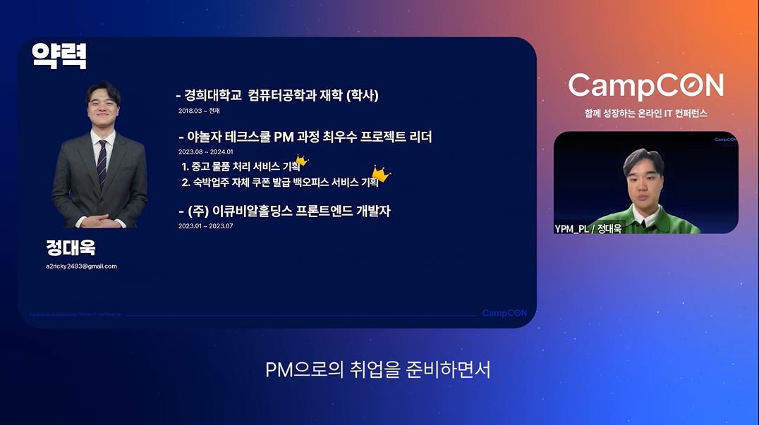 👨🏫정대욱 연사: 우선 저는 실무자나 현업자가 아닙니다. 여러분들과 같이 PM 직무로 취업을 준비하며 커리어를 쌓아나가고 있는 취준생이고요. 여러분들의 생각에 공감하고, 의문을 해결해 드리는 것에 강점이 있다고 생각합니다.