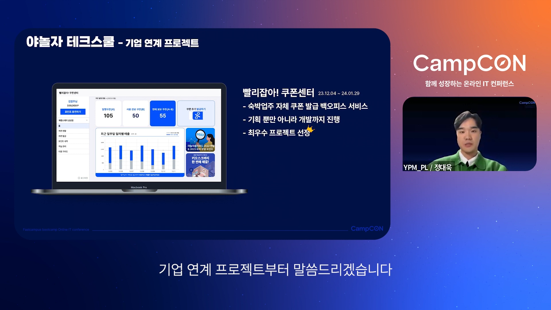 👨🏫정대욱 연사: 제가 진행했던 기업연계 프로젝트이자, 야놀자 최우수 프로젝트로 선정된 '빨리잡아! 쿠폰센터'는요.