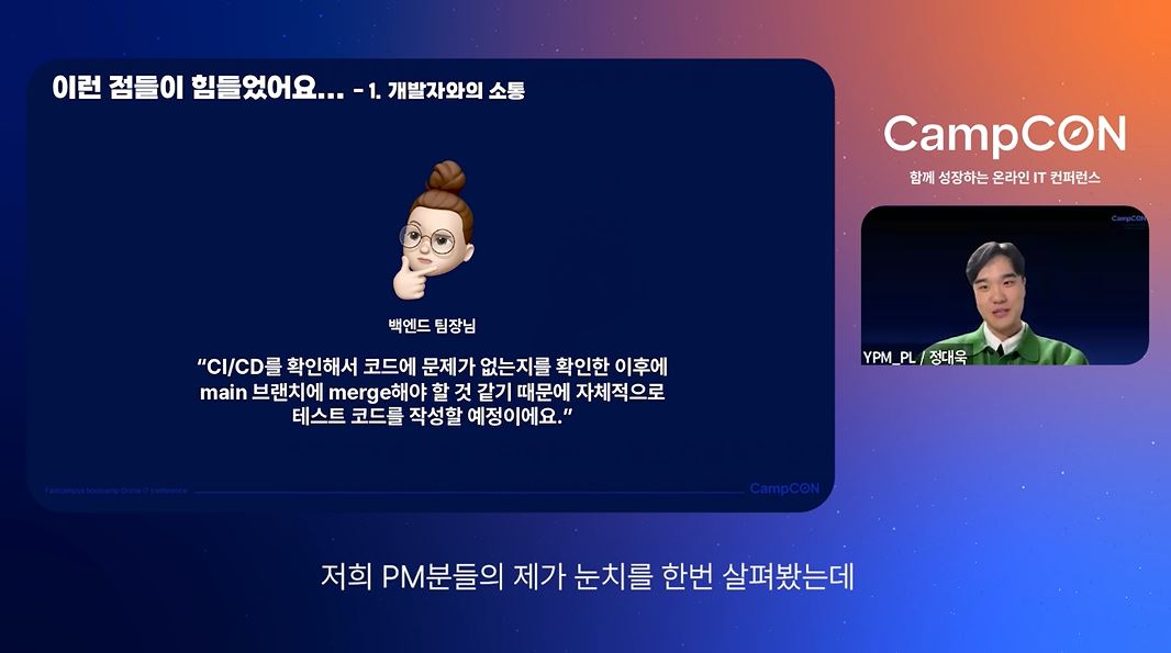 👨🏫정대욱 연사: 패스트캠퍼스의 기업연계 프로젝트는 PM 과정 뿐만 아니라 프론트엔드, 백엔드, UXUI 디자인 등 다양한 과정과 함께 진행하는데요. 장점도 있지만, 힘들었던 점도 있었습니다.