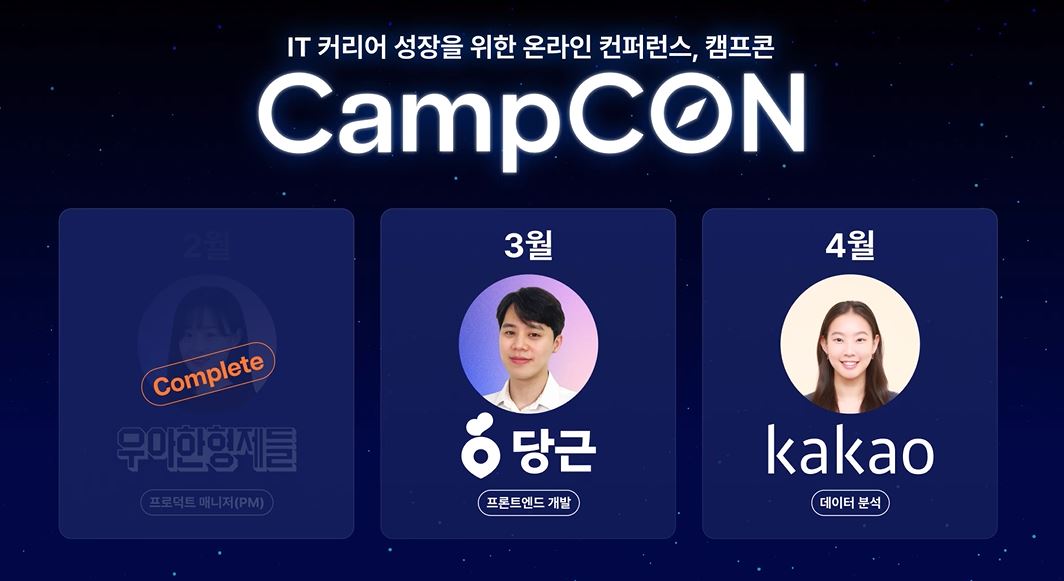 캠프콘은 IT 직무 분야(백엔드 / 프론트엔드 개발, PM, UX/UI 디자인, AI, 데이터 등)의 전문가들과 온라인으로 만나 커리어와 기술에 대한 이야기를 나누고, 고민에 대한 조언을 받을 수 있는 무료 온라인 IT 컨퍼런스입니다.
