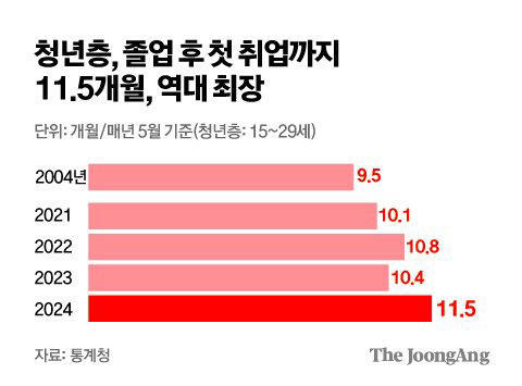 2024년 5월 통계청 조사 결과에 따르면, 청년들이 졸업 후 첫 취업까지 걸리는 시간이 역대 최장인 평균 11.5개월에 달하는 것으로 조사됐어요. 과거에는 졸업과 동시에 취업하는 경우가 많았지만, 졸업 후 취업까지 걸리는 시간이 점점 길어지고 있다는 것이죠.😢
